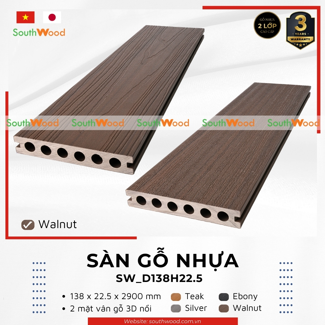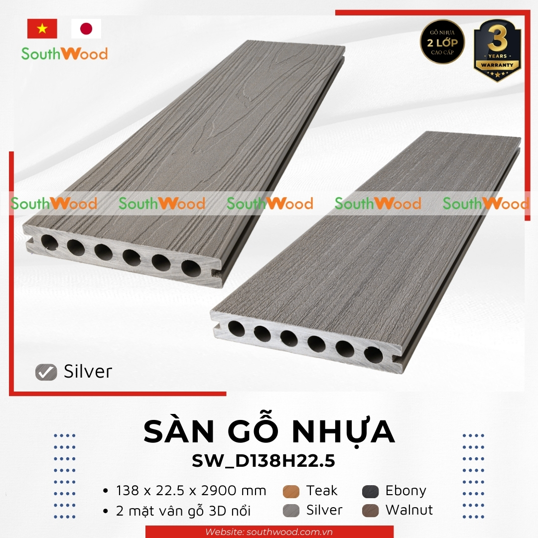 Sàn gỗ ngoài trời 2 lớp SW_D138H22.5 là một sản phẩm của Southwood. Sản phẩm này được kết hợp từ 60% gỗ tự nhiên nguyên sinh có độ cứng cao + 30% nhựa nguyên sinh + 10% lớp bảo vệ bề mặt & phụ gia an toàn. Sàn gỗ nhựa ngoài trời Southwood 2 lớp là sản phẩm gỗ nhựa duy nhất có bề mặt phủ lớp bảo vệ bằng nhựa cao cấp PVDF/ASA và UV ngoài trời, kết hợp cùng hạt màu AkzoNobel tốt nhất thế giới.