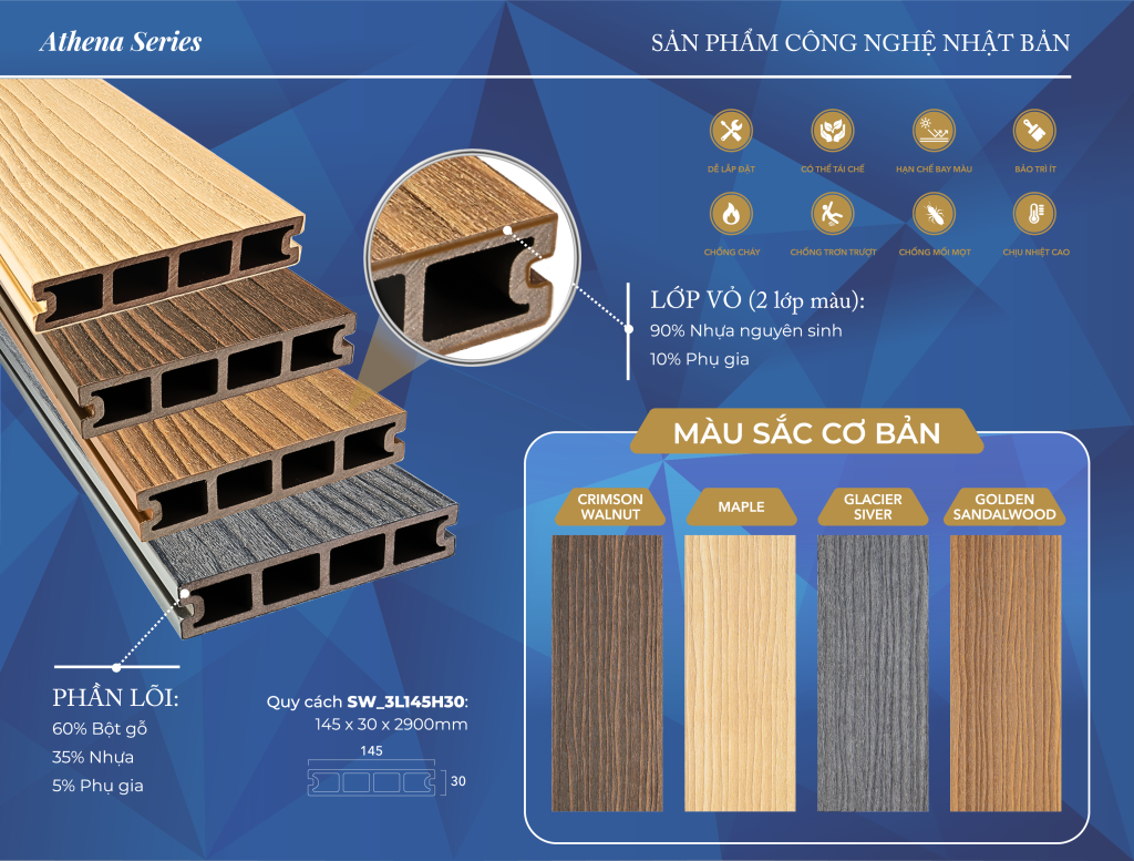 Sàn gỗ nhựa 3 lớp Athena là dòng vật liệu ngoại thất cao cấp thuộc nhóm WPC (Wood Plastic Composite) thế hệ mới. Với cấu tạo nhiều lớp và công nghệ ép đùn tiên tiến, sản phẩm mang đến độ bền vượt trội, khả năng kháng nước tuyệt đối và tính ổn định cao hơn so với gỗ nhựa truyền thống.