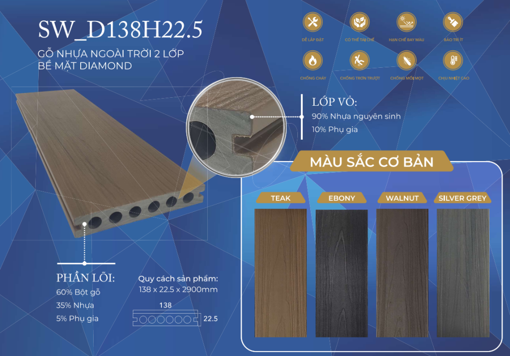 - 35% nhựa polymer cao cấp: tăng khả năng chống nước, chống mối mọt